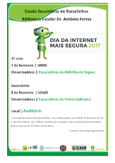 promover a sua utilização esclarecida, crítica e segura da internet, quer pelas crianças e jovens, quer pelas famílias e elevar os níveis de Literacia da Informação, a Escola Secundária de Barcelinhos, em colaboração com a Beaf, Professores de TIC e de Informática, vai realizar várias sessões nos dias 7 e 8 de fevereiro de 2017.